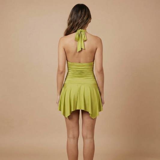 Women's Cocktail Halter Ruched Mini Dress with Gold Rings